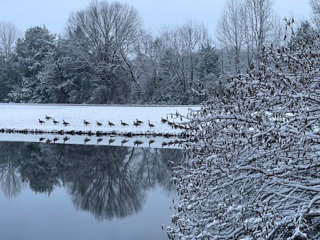 of geese is huddled on the